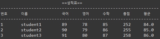 // 번호, 이름, 과목별 점수와 총점, 평균 출력