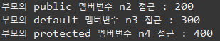 System.out.println("부모의 default 멤버변수 n3 접근 : " + this.n3);