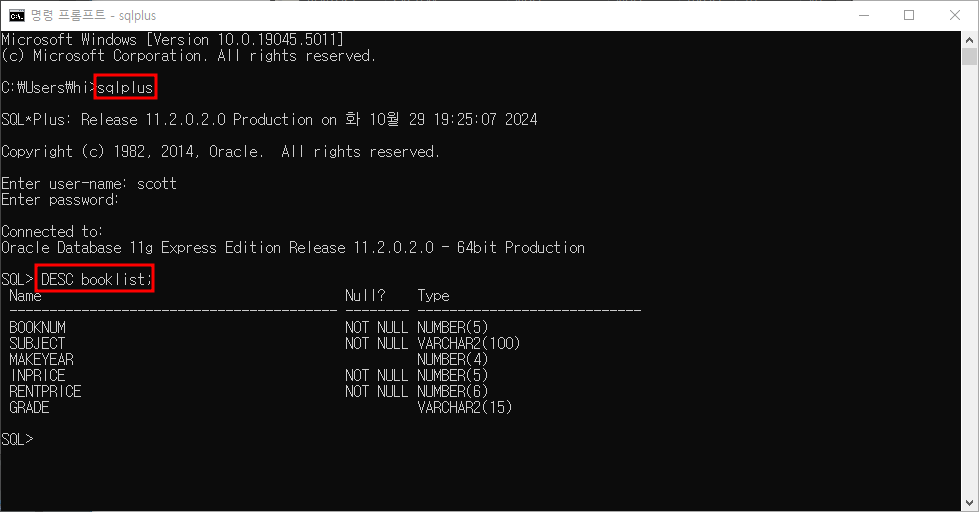 커맨드창(cmd)에서 테이블의 필드 리스트와 데이터 형식을 확인할 수 있다.