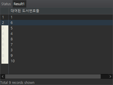 예제5. rentlist에서 bnum의 데이터 중 중복을 제외하고, "대여된 도서번호들" 이란 데이터로 출력한다면?