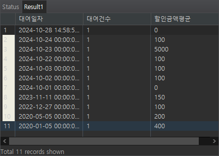 SELECT rentdate AS "대여일자", COUNT(*) AS "대여건수", AVG(discount) AS "할인금액평균"