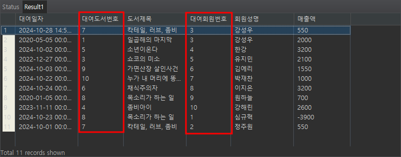 대여를 한 적 없어 출력되지 않았던 회원이 (+) 로 OUTER JOIN 됨에 따라 함께 출력된 걸 확인할 수 있다.