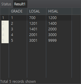 예제1. emp 테이블의 사원이름(ename)과 급여(sal), salgrade 테이블의 급여등급(grade) 필드를 출력하되, emp 테이블의 급여(sal)가 salgrade 테이블의 급여최소값(losal)보다 크고 급여최대값(hisal)보다 작은 행을 조인한다.