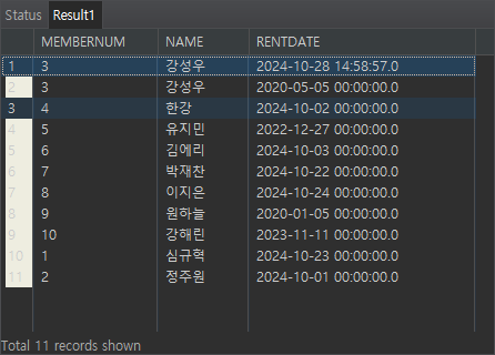 예제1. memberlist 테이블에 회원번호(membernum)과 회원이름(name), rentlist 테이블에 대여일자(rentdate)를 출력하되, 두 테이블의 회원번호가 일치하는 경우만 출력한다.