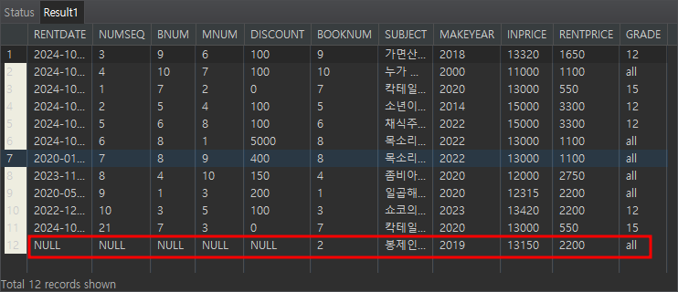 booklist 의 데이터는 모두 나오지만 rentlist 의 조건에 만족하는 데이터가 있으면 해당 데이터를, 없으면 null이 출력된다.