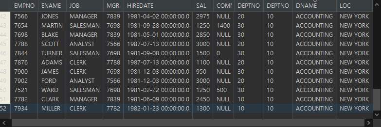 emp 테이블과 dept 테이블의 필드를 합해 총 12개의 필드가 생성되었으며 레코드가 다른 테이블의 레코드와 매칭되어 52개의(..) 레코드가 생성됐다.
