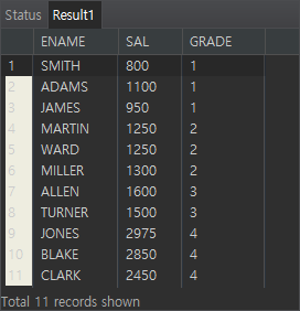 예제1. emp 테이블의 사원이름(ename)과 급여(sal), salgrade 테이블의 급여등급(grade) 필드를 출력하되, emp 테이블의 급여(sal)가 salgrade 테이블의 급여최소값(losal)보다 크고 급여최대값(hisal)보다 작은 행을 조인한다.