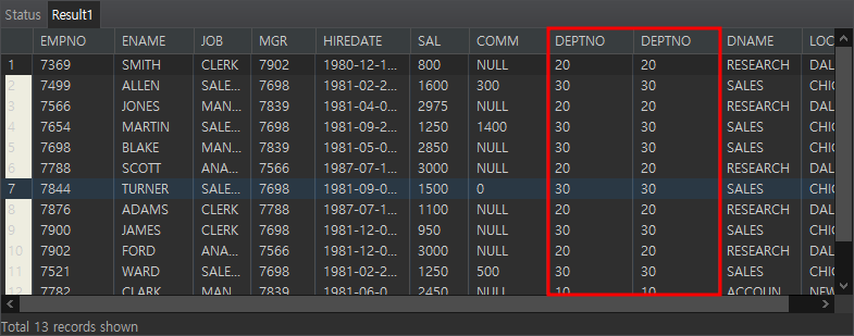 emp 테이블과 dept 테이블에서 공통적으로 존재하는 필드인 deptno. 이런 deptno 의 값이 두 테이블에서 같은 행끼리 연결하여 결과를 생성한 것이다.