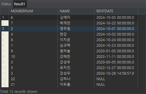 대여를 한 적 없어 출력되지 않았던 회원이 (+) 로 OUTER JOIN 됨에 따라 함께 출력된 걸 확인할 수 있다.