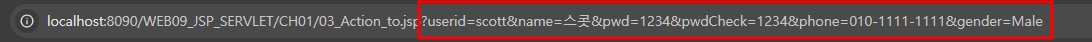 넘어간 03_Action_to.jsp 위치 주소에 ? 가 붙으면서 우리가 작성한 값들이 노출된다.