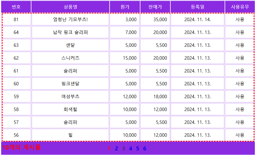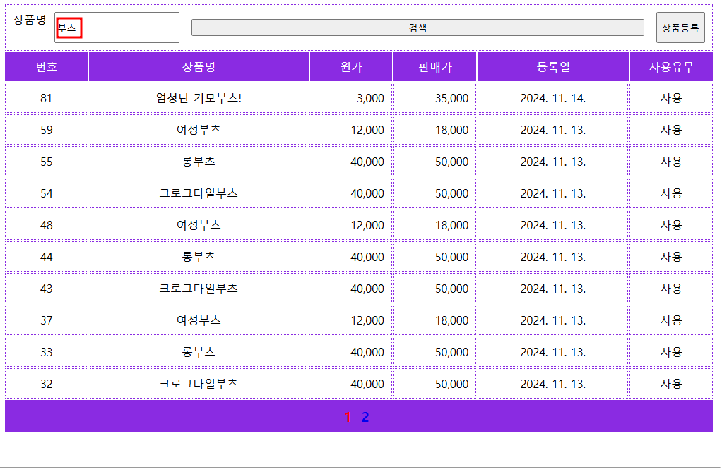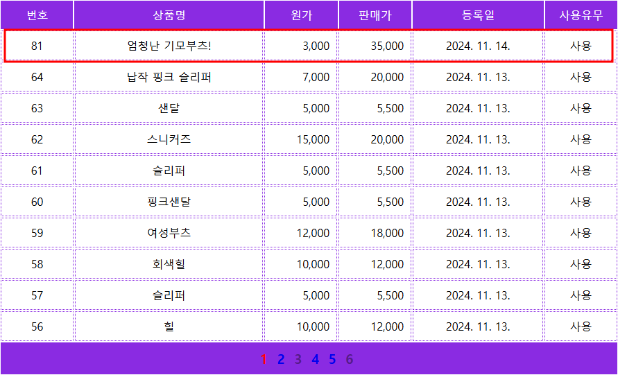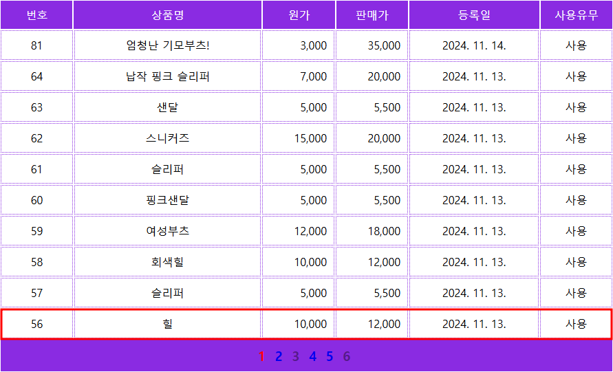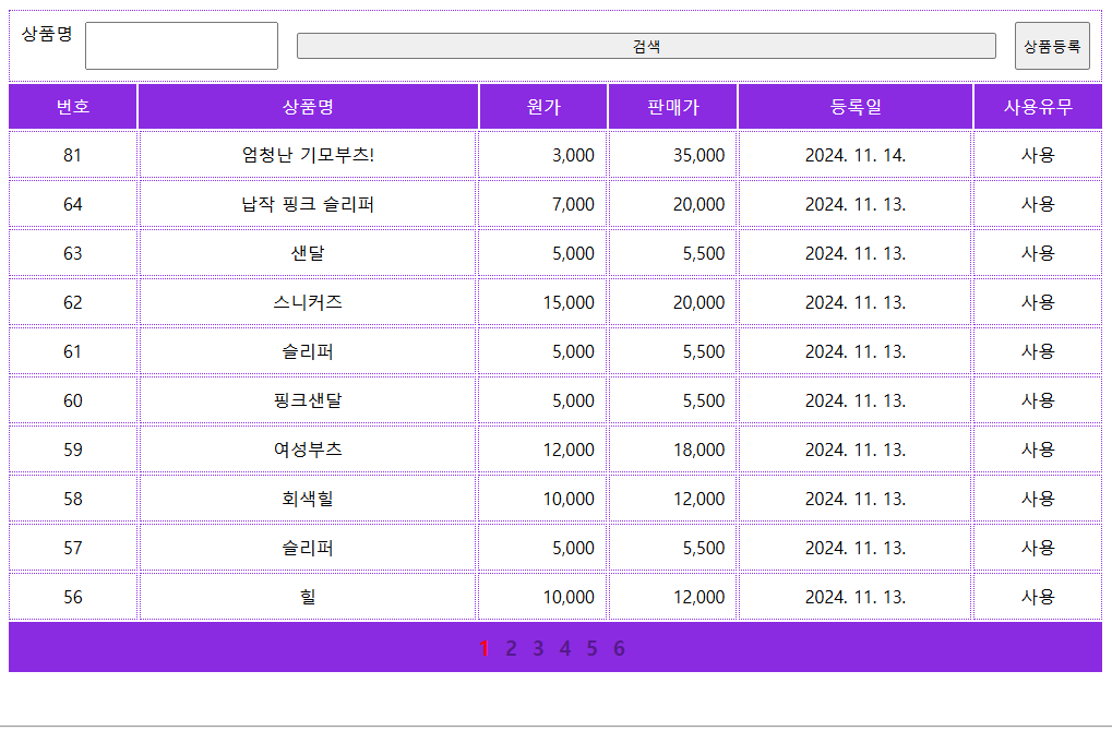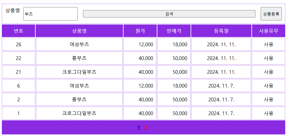 게시판 기능에 필수적인 페이징을 구현해보고자 한다. 해당 예시는 쇼핑몰 제작 실습에서 관리자가 상품을 관리하는 페이지다.