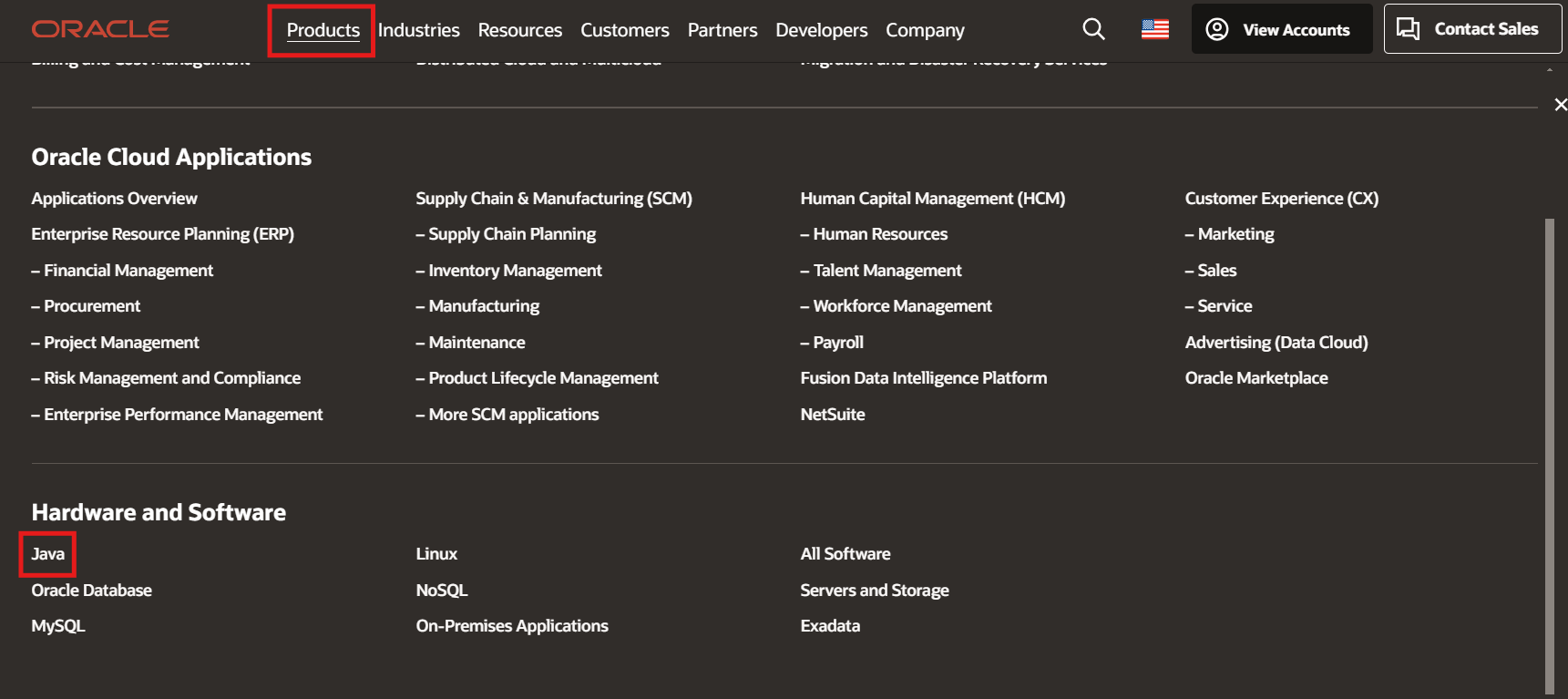 Products 탭 클릭 → 밑에 Hardware and Software 부분의 Java 클릭