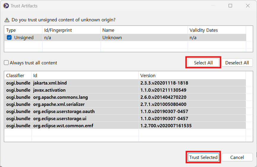 우리는 공식 사이트에서 파일을 받았기 때문에 믿으면 된다. Select All → Trust Selected 클릭