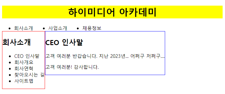 <header style="background:yellow;"><h1 align="center">하이미디어 아카데미</h1></header>