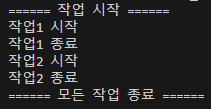 마찬가지로 '작업1 시작' → '작업1 종료' → '작업2 시작' → '작업2 종료' 순서대로 실행을 했다.