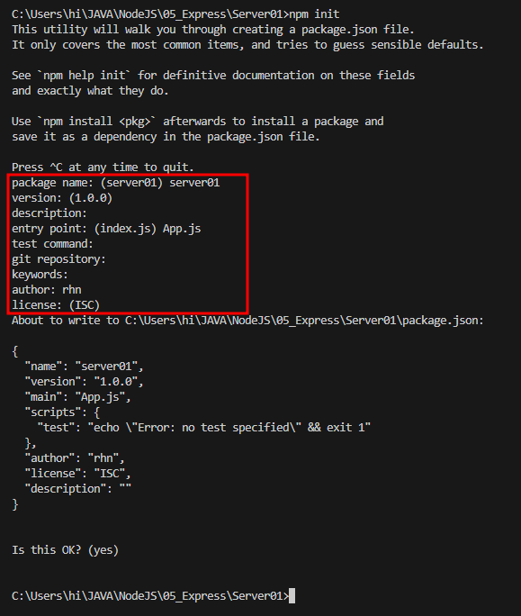 엔터마저도 귀찮다면 대답을 전부 yes 로 입력하겠다는 명령 npm init -y 를 입력해도 된다.