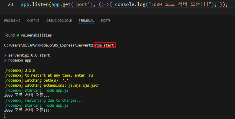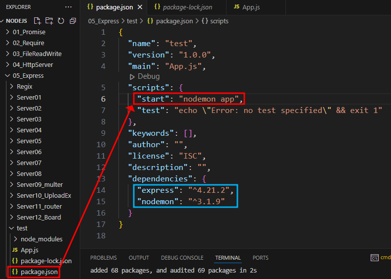 파란 네모 부분에 아까 설치한 express 와 nodemon 의존성이 추가되어 있는 것을 확인할 수 있다.