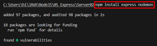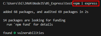 터미널에 npm i express 명령을 입력해 express 프레임워크를 설치한다.