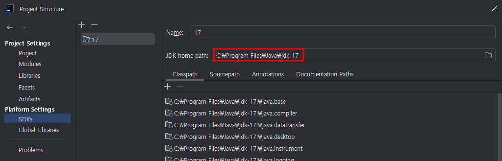 사용한 jdk 버전은 인텔리제이 기준으로 File → Project Structure → SDKs 에서 확인 가능하다.