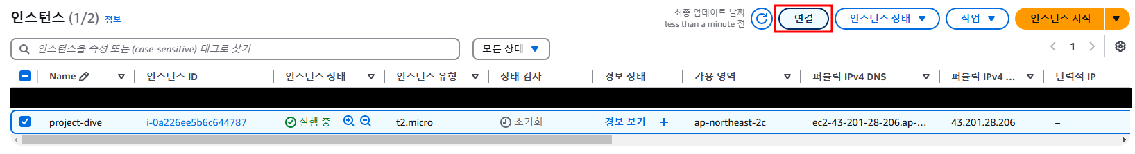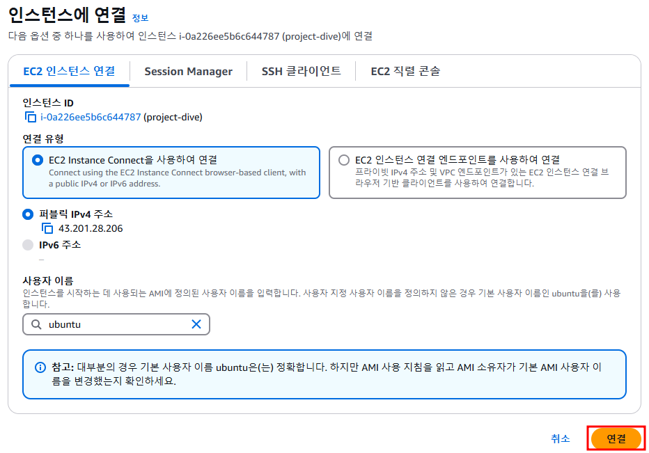 연결 버튼을 눌러 배포를 위한 AWS ubuntu 환경으로 들어가겠다.