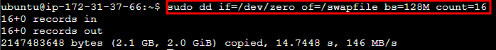 sudo dd if=/dev/zero of=/swapfile bs=128M count=16