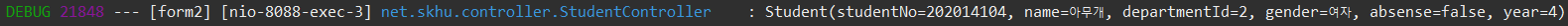 log.debug(student.toString()); // 입력 받은 form 데이터 값(student) 출력