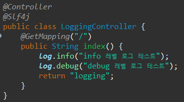 Logger 인터페이스 사용 대신 @Slf4j 어노테이션만 붙여주면 된다.