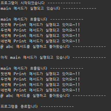 System.out.println("@ abc 메서드를 실행하고 돌아왔습니다 -------------\n");