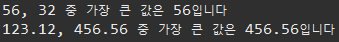 System.out.println("123.12, 456.56 중 가장 큰 값은 " + maxValueD + "입니다");