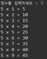// 정수 하나를 입력 받아서 그 정수에 해당하는 구구단 출력